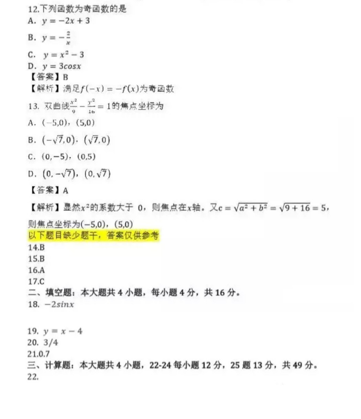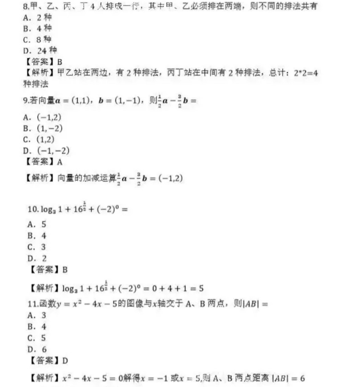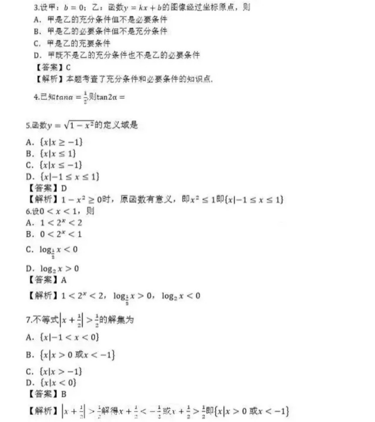 2019年成人高考高起点数学(文)考试真题与答案